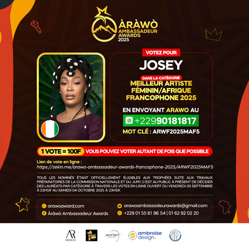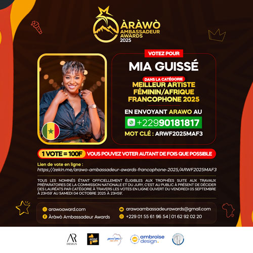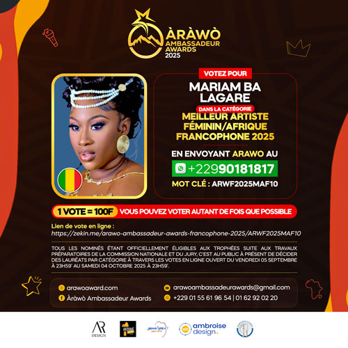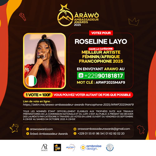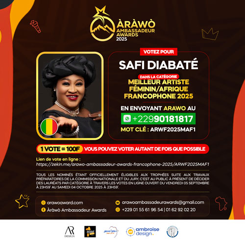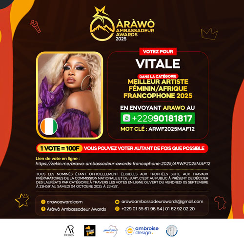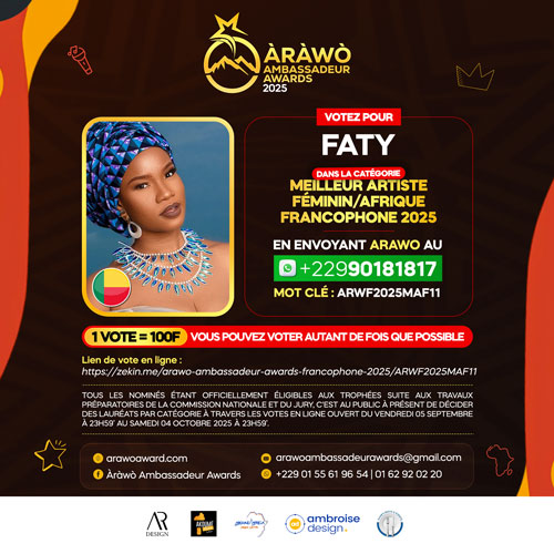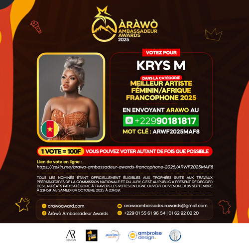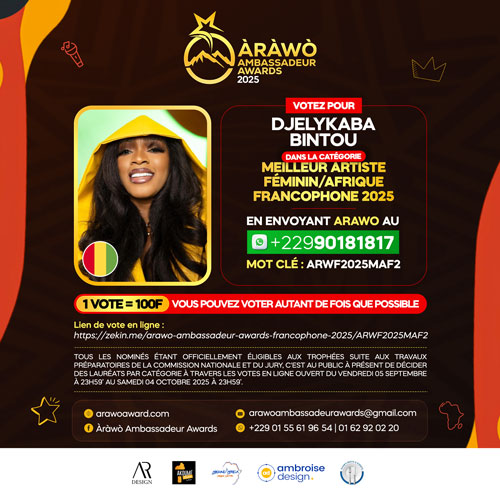 Les ÀRÀWÒ AMBASSADEUR AWARDS continuent de célébrer les plus grands talents francophones. Une catégorie en particulier honore les voix qui portent la culture africaine au-delà des frontières. Il s’agit en effet du prix de la Meilleure Artiste Féminin.